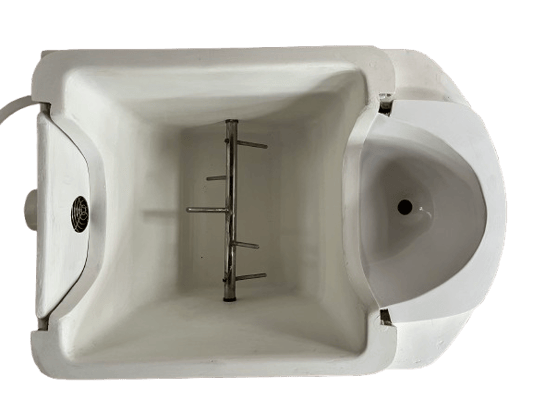 撹拌槽で、大便だけを処理するので、乾燥等で大きな電力は使いません。1ワットの排気ファンで攪拌槽で発生する二酸化炭素、水分そして臭気を屋外に排出します