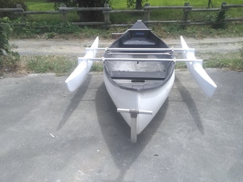 カナディアンカヌーに長さ2、4メートルのアウトリガーを両サイドに付けました。安定が増し浮沈カヌーになります。