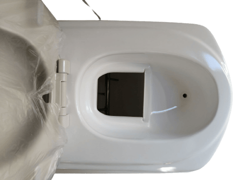 大小分離の便器には開閉扉が付いています。尿は便器前の出口から直接、2リットルのタンクに入ります。
