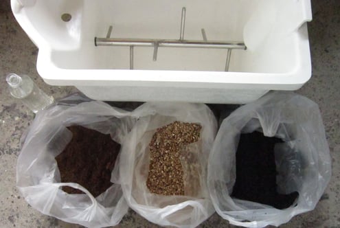 1 撹拌槽に3種類のコンポスト基材と微生物基材少量を撹拌器の棒が隠れるまで(約10リットル)投入します。