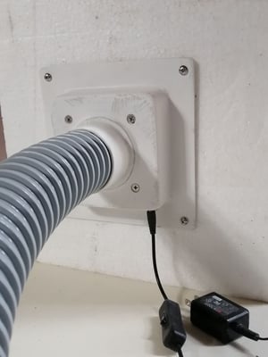 室内はダクトホースでトイレ本体とつなぎ、トイレの排ガスを吸い出します。