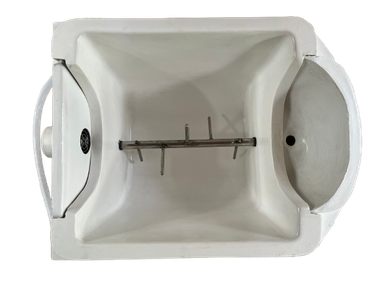 こまらんトイレに入れるコンポスト基材はピートモス(pHを調整したもの)、バーミキュライト、くん炭を同量、撹拌槽に入れます。おおよそ18リットルですが、撹拌器の横棒が見えなくなる程度で十分です。