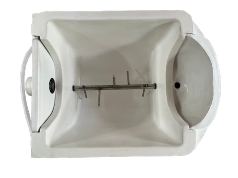 コンポスト基材を撹拌する攪拌器は手動です。40型の場合、本体フロント部に撹拌器を回すハンドルが付いています。使用後、フロント部前でハンドルを1,2回まわして下さい。コンポストt基材を混ざることによって、分解が進み、便の臭気もなくなります。
