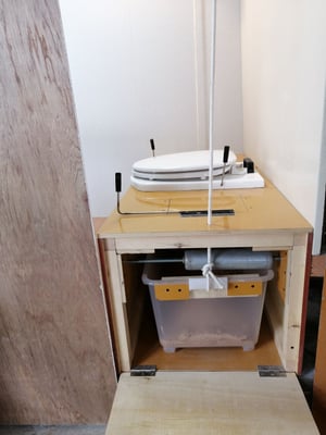 コンポスト基材が入ったコンテナの入れ替えですが、収納箱の側面の扉を開け、コンテナを出します。