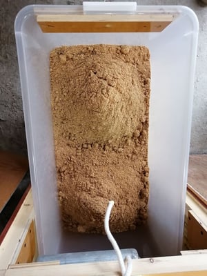 コンテナ内のコンポスト基材は、堆肥として利用する場合、ダンボール箱等に移し保管、ダンボール内で熟成してから使用します。