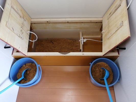 便器横の扉を開けてバケツのコンポスト基材(おがくず等)を便の上にふりかけます。