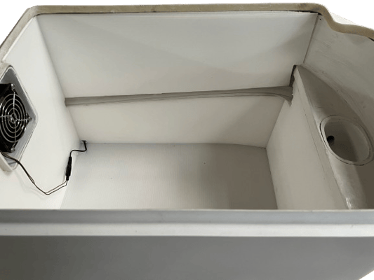右手側側面の直径25センチの輪っぱ式ハンドルで撹拌槽前方の撹拌器を回します。回す回数は、大便が見えなくなる程度、1,2回で十分です。コンポスト基材に混ざった大便は自然に分解、姿はなくなります。側面後ろ側の黒丸は12ボルトの排気ファン用の電源ジャックです。