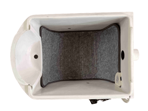 尿と便を分けることで、コンポスト基材が効率よく便を分解します。便器底の扉でニオイの発生、ハエ等の侵入を防ぎ、美観、機能的にも安心です。尿は便器前側の排出口から便器下部の受け皿に入り、本体ケース側面の配管で屋外に出て、タンクで貯めます。
