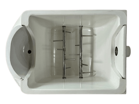 撹拌器を2連設け、前方の輪っぱ式ハンドルで撹拌します。コンポスト基材が片寄ってくれば、後方の撹拌器を補助ハンドルで前側に寄せて使用します。既存のトイレスペースに設置でき、水道からの取水ができれば、ウォシュレット便座も使えます。