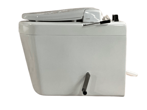 トイレに設置した際、標準仕様は排気管、尿配管が本体背面の屋外に出しますが、座った状態で屋外が左右にどちらかに屋外がある場合、本体と壁体の間に排気ボックスを設置し排気管、尿配管を側面の屋外に出します。