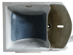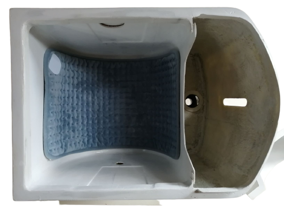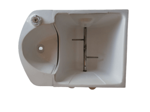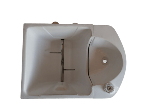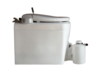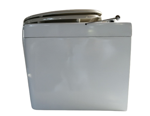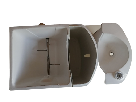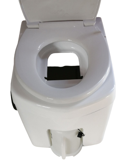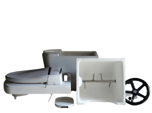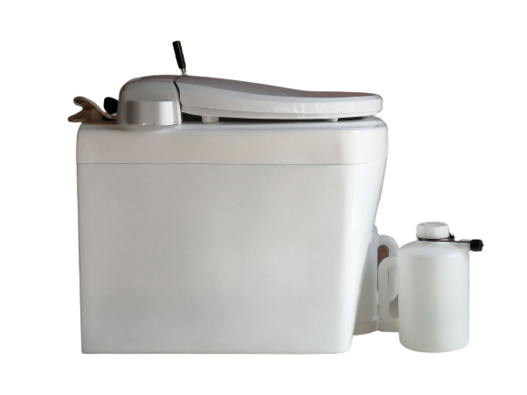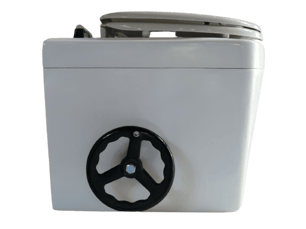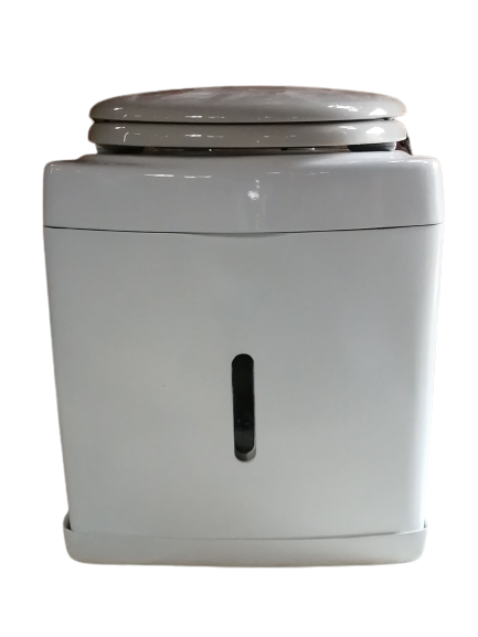 便器には暖房便座も付けられます。左手側には便器底の開閉扉を操作するハンドルレバーが付きます。尿は前部の穴から下の2リットルタンクに入ります。